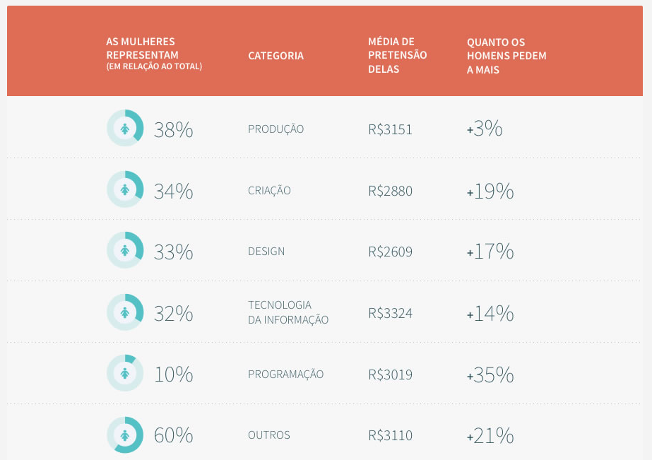 Porém, hoje a realidade tornou-se bem diferente do início da computação, época na qual a maioria dos profissionais e estudantes de computação eram mulheres. Hoje vemos uma baixa procura de mulheres pelas carreiras de computação, em especial a engenharia, há uma desvalorização da mulher no mercado de trabalho e aquelas que se formam na área acabam ao longo da carreira migrando para outras áreas, como gestão e administração. A problemática pode ser ilustrada através da tabela abaixo, que foi feita pelo Trampos.co, um site para busca de empregos. Apesar de não ser uma pesquisa formal e sim apenas na base de dados dos profissionais cadastrados nesse site, ela mostra bem as porcentagens discrepantes entre os gêneros nas áreas de tecnologia da informação e programação. Ainda mostra um dado alarmante sobre a questão da pretensão salarial, que talvez seja uma pista do porquê as mulheres ganhem menos que os homens exercendo o mesmo cargo. No geral, as mulheres tem uma pretensão salarial menor do que as do homens, chegando a casos extremos como em programação.